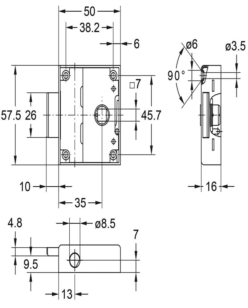 aufliegend, Vierkantnuss 7 mm, Kasten Stahl vernickelt, umstellbar von rechts auf links, Lieferzustand= rechts