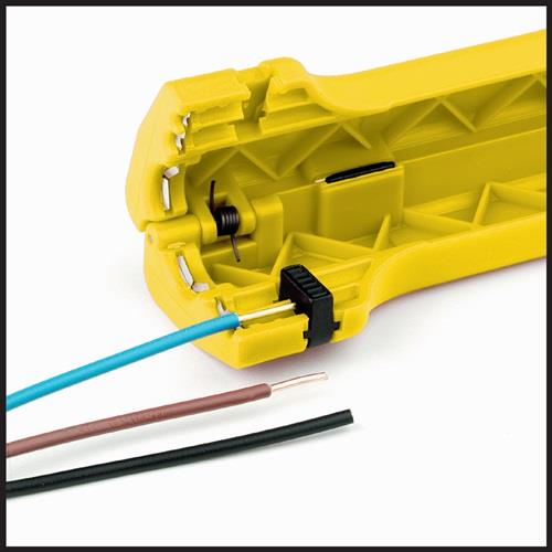 Rundkabel-Entmanteler, Nr. 460129Kunststoffgriffteil hohl, mit festen Messern. Zum Entmanteln von NYM-Kabeln, auch für Linkshänder geeignet. Abmantelung der schweren äußeren Isolierung und Abisoliermöglichkeit für die Litze durch wechselbaren Anschlag.
