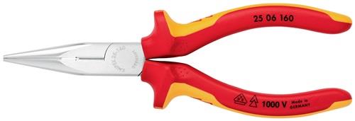 VDE-Radiozange KNIPEX Nr. 2506, gerade FormDIN ISO 5745, flach-runde Backen, Greifflächen gezahnt, Schneiden zusätzlich induktiv gehärtet. Kopf verchromt. Griffe mit Mehrkomponenten-Hüllen. Isoliert bis 1000 V, nach IEC 60900, DIN EN 60900, ASTM F1505.Aus Vanadium-Elektrostahl, ölgehärtet. Für harten Draht = 1800 N/mm² bis 1,6 mm Ø.