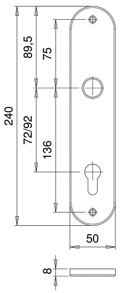 EDI Langschild 1206; Produkttyp: Langschild; Produkttyp (Hersteller): Langschild; Form: oval; Befestigungsart: sichtbar verschraubt; Anwendung: innen; Material: Aluminium; Länge: 240 mm; Breite: 50 mm; Höhe: 8 mm; Türart: Vollblatt; Einsatzbereich: Tür; Ausführung: für Türdrücker; Stütznocken: ohne Stütznocken; DIN-Richtung: DIN Links-Rechts; Farbe: silber; Farbton: naturfarben; Oberfläche: eloxiert; Lochung: Profilzylinder gelocht; Entfernung: 72 mm; Türstärke min.: 40 mm; Türstärke max.: 45 mm