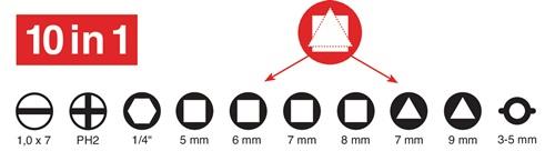 Schaltschrank-SchlüsselAus Zink-Druckguss. Innenvierkant 6, 7 und 8 mm, Innendreikant 9 mm, Buntbart 3 bis 5 mm, Doppelbit Schlitz 1 x 7 mm und PH 2 und Kunststoffadapter 1/4" und Vierkant-Heizkörper-Ventilschlüssel.
