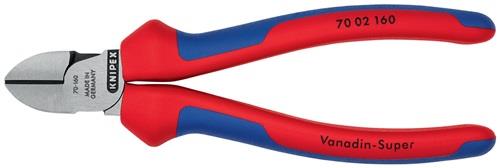 Seitenschneider Knipex Nr. 7002DIN ISO 5749, Kopf poliert, Schneiden zusätzlich induktiv gehärtet (62 HRC), Griffe mit Mehrkomponenten-Hüllen. Zange schwarz atramentiert.Aus Vanadium-Elektrostahl, in Öl gehärtet und angelassen.Weicher Draht = 220 N/mm²Mit